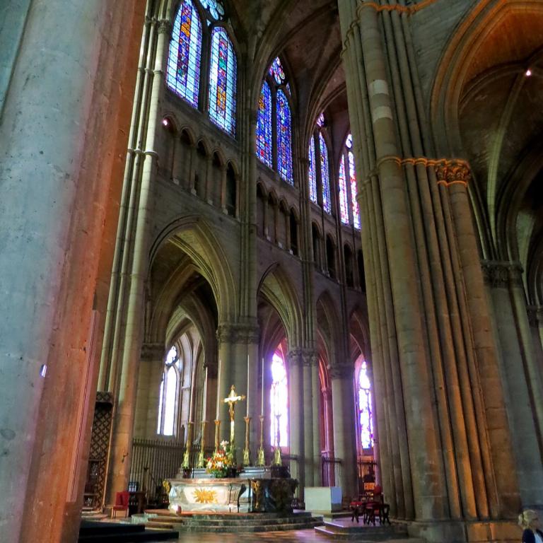 Anschließend stand wie immer auf unseren Reisen ein kultureller Höhepunkt auf dem Programm. Eine kompetente, deutschsprechende Dame führte uns durch die Kathedrale von Reims. Diese prächtige gotische Kathedrale war Zeuge von Jahrhunderten französischer Geschichte. Über 600 Jahre war sie die Krönungskirche für alle französischen Könige. Wie die Stadt Reims wurde auch die Kathedrale in drei Kriegen sehr in Mitleidenschaft gezogen: 1870/1871 im preußisch-französischen Krieg, dann im 1. und auch im 2. Weltkrieg. In dieser Kathedrale hat Frankreich und die Welt vom großen Staatsmann Charles de Gaulle Abschied genommen.